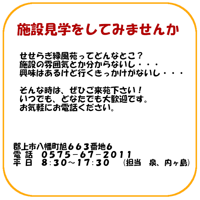 せせらぎ緑風苑の特養棟はな、1階と2階が特別養護老人ホームで個室と二人部屋になっとります。 又、平成23年には山側に新しく特別養護老人ホームが増設されたんやんな。
